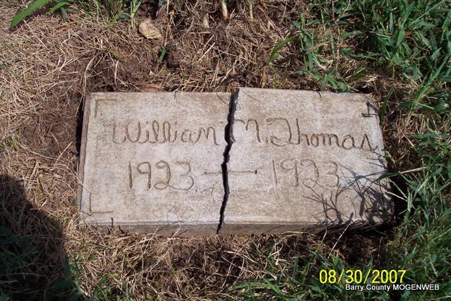 | THOMAS, William M. | 1923 | 1923 | Research Note: Stone matches the one for Etta Evelyn Thomas. Son of Chalmer Thomas born Barry Co., MO and Elsie May Kinser born Knox Co., KY. | Note Phyllis Long Headstone Lanny and Mary Photo Diana Cope |