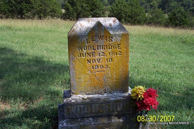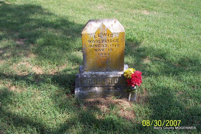 Research Note: Civil War Veteran. Pvt., Co. E., 2nd AR Cav. Served from Aug. 1, 1863 to Aug. 1, 1865. Researchers say he was the son of James and Nancy Lucinda (Pemberton) Wooldridge. He married Sarah Mary Cook in 1844 at Greensburgh, Green Co., Kentucky. - Cassville Republican, July 9, 1896 - A Few of the Pioneers: Louis Wooldridge is the oldest resident of Mineral Township, 86 years of age. He lives on the north branch of Rock House Creek. - Another Photo | Online Newspapers 1890 Vet. Census Phyllis Long Headstone Lanny and Mary Photos Diana Cope |