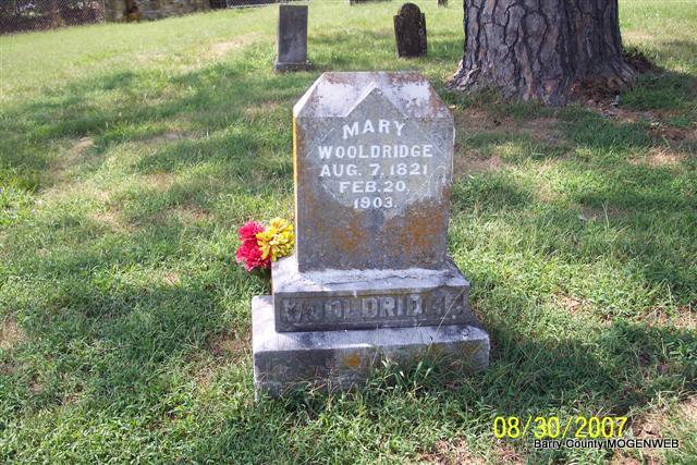 Research Note: Researchers say she was the daughter of Thomas and Margaret (Jackman) Cook. She married Lewis W. Wooldridge in 1844 at Greensburgh, Green Co., Kentucky. | Note Phyllis Long Photo Diana Cope |