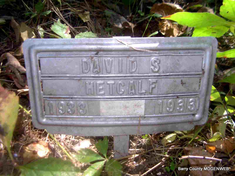 | METCALF, Leonard | Feb. 25, 1897 | Mar. 9, 1897 | Inscription: "Son" - Research Note: Son of Elijah and Mary Frances (Sparks) Metcalf. | Family Records Patty McWilliams Photo Jay Trace |