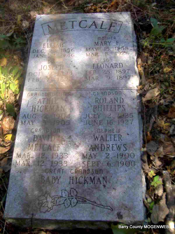 Inscription: "Father" - Research Note: Elijah James Metcalf, son of Hiram Casteel Metcalf, was born Dec. 23, 1856 in Estill Co., KY, and died Jan. 24, 1946 in Exeter, Barry Co., MO. He was buried in Metcalf Cemetery, Thomas Hollow, Exeter, MO and he married Mary Frances Sparks on Feb. 5, 1878 in KY. She was born May 15, 1858 in Jackson Co., KY, and died Mar. 18, 1928 in Star Hollow, McDonald Co., MO. - Son of Hiram Metcalf and Mary Ann Gabbard, both born KY. Mrs. Lizzie Hickman of Exeter, MO was the informant on the death certificate. - 1930 Census, Liberty, Barry, Missouri - Elijah Metcalf, head, widowed, age 73; J. David Metcalf, age 42, single; Wanda M. Scroggins, age 14, granddaughter. - Cassville Paper, Jan. 31, 1946 - Elijah J. Metcalf, 89, died at this home in Thomas Hollow Thursday, January 24, from infirmative due to his age. Mr. Metcalf was born in Kentucky but came to Barry County when a young man and lived in that community where he passed away for more than 50 years. He was a good citizen and was held in high esteem by all who knew him. He was a son of Hiram and Mary Ann Metcalf and was married to Mary Francis Sparks on Feb. 5, 1878. Eleven children were born to this union, four of the children preceded him in death. Mrs. Metcalf preceded him in death some years ago. Three sons, Dave Metcalf of Washington, Dan Metcalf of Idaho and Sherman Metcalf of Colorado, and four daughters, Mrs. Sarah Phillips of Washington, Mrs. William Hickman of Powell, Mrs. Ernest Bryson of Colorado and Mrs. Ed Rydner of Exeter, survive. Other survivors are three brothers, Elisha, of Exeter, and Rueben and John of Estill County, Ky., and two sisters, Mrs. Martha Land, Neosho; and Frances Clark, Butterfield; 25 grandchildren, 72 great-grandchildren and eight great-great-grandchildren together with a host of other relatives and friends. He was a staunch and devoted member of the Baptist Church. Funeral services were held Saturday afternoon with burial in the nearby Metcalf Cemetery. The relatives have the sympathy of their many friends. The Rev. Chas. VanZandt was in charge. | Death Certificate Online Obit Phyllis Long Note Photo Jay Trace |
