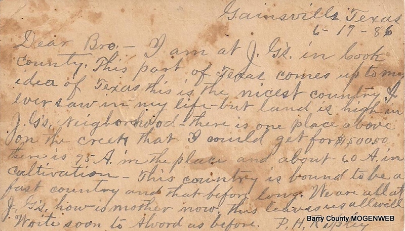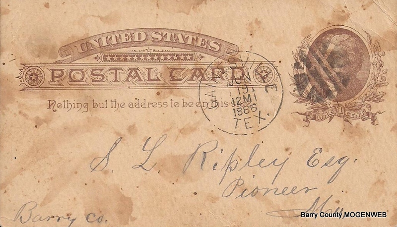 S. L. Ripley Esg Pioneer Barry Co. Mo Side two: Gainsville Texas 6-19-86 Dear Bro. - I am at J. G.'s in Cook county. This part of the Texas comes up to my idea of Texas this is the nicest country I ever saw in my life- but land is high in J. G.'s neigborhood- there is one place above on the creek that I could get for $1,500.00 there is 95 A. in place and about 60 A. in cultivation- This country is bound to be a fast country and that before long. We are all at J. G. 's. how is mother now. This leaves us all well Write soon to Alvord us before. P. H. Ripley Dated 1886 - Jerry said, "My great grandmother was Susan Irene (Ripley) Stephenson. The postcard is addressed to her brother, Septemous L. Ripley. The postcard is from another brother, Pleasant Hillary Ripley." Submitted by Jerry Stephenson |