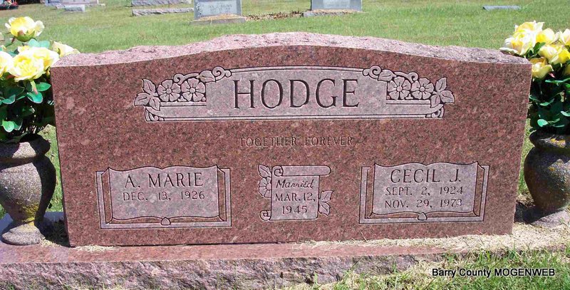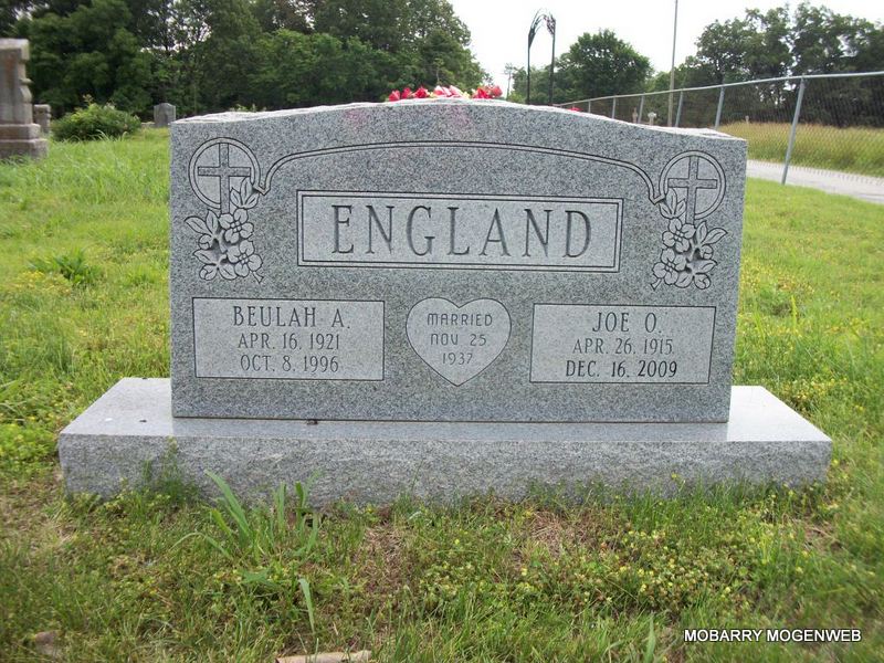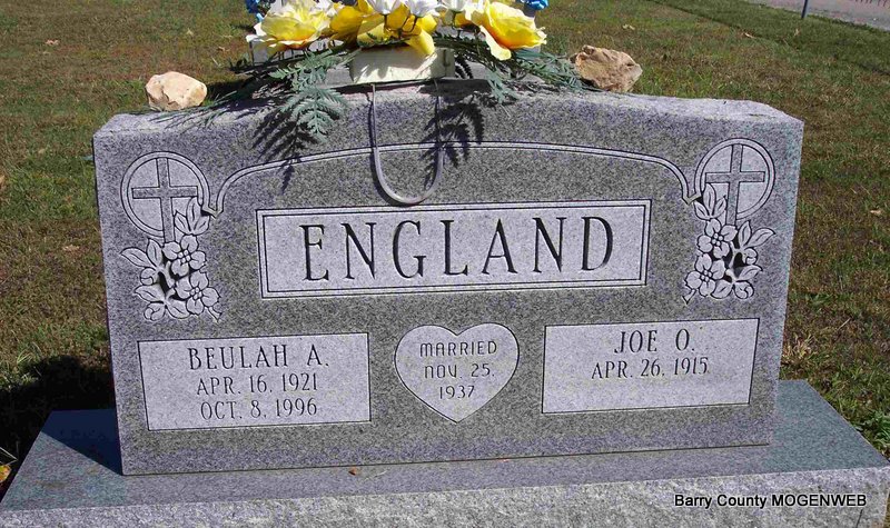 SSW: Beulah A. - Inscription: "Married Nov. 25, 1937" Research Note: His residence was given as Aurora, MO. He was a son of George Henry and Minerva (Brock) England. On November 25, 1937, he was united in marriage to Beulah Alvina Henson, who preceded him in death on October 8, 1996. Whistling Joe, as many people knew him, received his education at Hailey and Gaddis Schools and then Cassville High School. He farmed his entire life, raising cattle and crops. He was also a self taught and skilled carpenter, masonry and electrician. - Another Photo | Cassville Democrat Dec. 23, 2009 Phyllis Long Photos Diana Cope |
