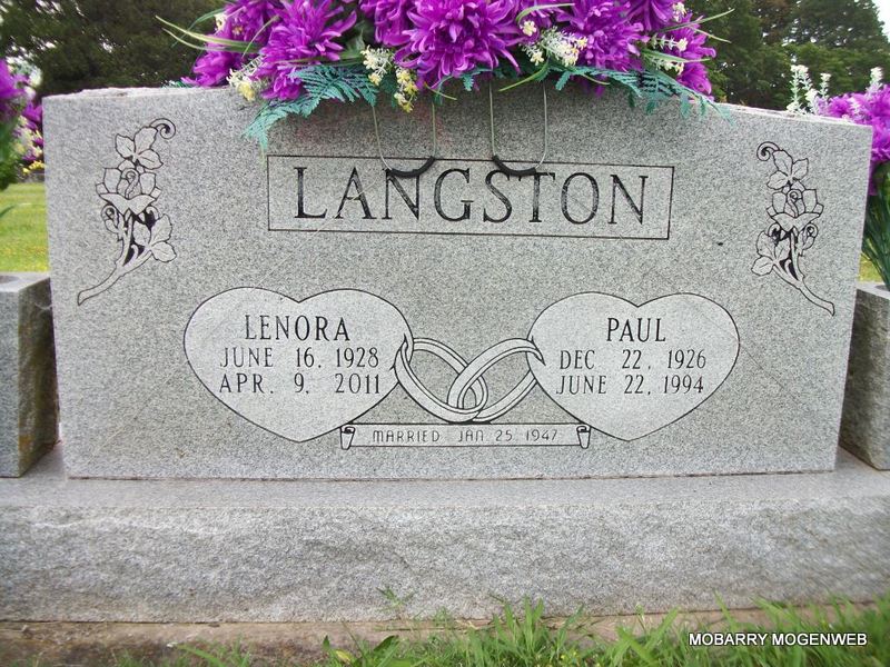 SSW: Paul - Inscription: "Married Jan. 25, 1947" - Research Note: Lenora was the daughter of Robert Martin and Maggie (Moore) Brandon. On January 25, 1947, she was united in marriage to Paul Langston and to this union four children were born. Paul preceded her in death on June 22, 1994. She married Morris Moudy on December 26, 1998. He preceded her in death on August 21, 2001. Also preceding her in death were her parents and a daughter in infancy. Lenora grew up and received her education in Cassville, graduating from Cassville High School. She and Paul resided in Arkansas, Kansas and California. She moved to Cassville in the early 1980's to make her home. - Another Photo | Fohn Funeral Home Phyllis Long Photos Diana Cope |