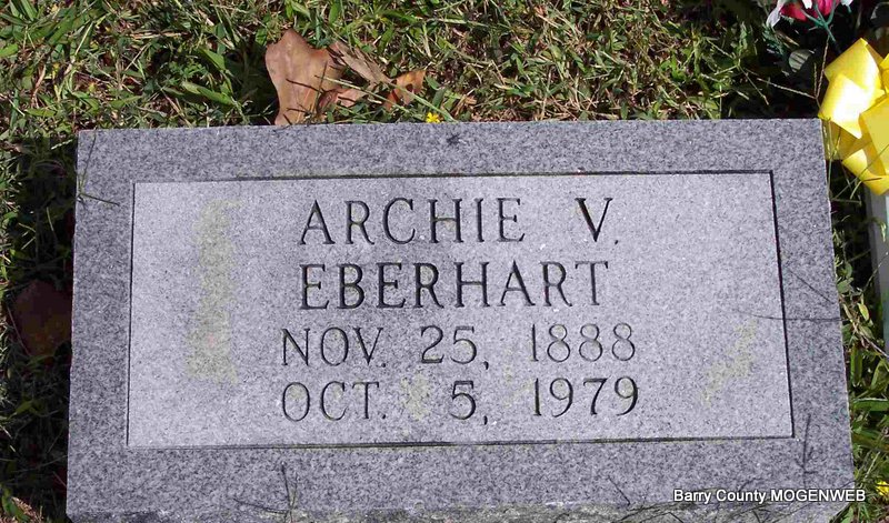 Research Note: Son of Henry Joseph Eberhart and Mary Jane Bantrup. He had lived in the Cassville area the last 14 years, moving here from Bellflower,Ca. He was a retired mechanic and a veteran of World War II. He was a member of the Baptist Church. Archie V. Eberhart first married Georgia Jane Morris on Dec. 5, 1909 in Cole Co., MO. Second, Dixie Ann (Scrivner) Norfleet. Dixie died in 1965 in Los Angeles Co., CA. Third wife was Bertha. | Headstone Norma Hayward Obit Census CA Death Index Phyllis Long Photo Diana Cope |