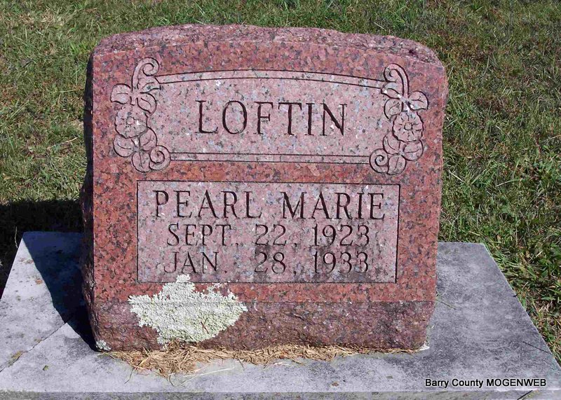 Research Note: Daughter of David Scott Evans and Nancy Emmaline Park. Second wife of Lester Loftin. - November 30, 1916, Thursday, Cassville Republican - Lester Loftin and Miss Margaret Evans were married Monday at the recorder's office by Probate Judge C. M. Landis. Mr. Loftin is a member of the firm of Loftin and Moore at Mineral Springs and a young man of exemplary habits and Mrs. Loftin is from Pennsylvania and has been visiting relatives at Mineral for some time and made many friends. The young couple will make their home at Mineral and their many friends wish them much happiness. - Cassville Republican, Thursday, May 23, 1918 - Grant Evans of New Castle, Pa., spent a few days last week with his sister, Mrs. Lester Loftin, of near Mineral Springs. Young Evans is in the United States Navy. Having been granted a furlough he took advantage of it to make the trip. - Same paper - Mrs. Evans of Pennsylvania and two daughters and a sister-in-law and three children are visiting Mrs. Lester Loftin. - Cassville Republican, July 3, 1919 - Mrs. Evans and children returned home Thursday of last week after several weeks visit with her daughter, Mrs. Lester Loftin. | Headstone Norma Hayward Online Newspapers Phyllis Long Photo Diana Cope |