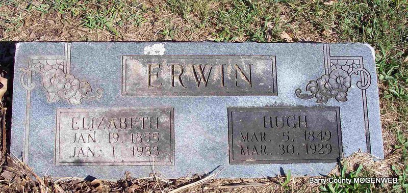SSW: Elizabeth: Research Note: According to his death certificate, he died from the effects of the flu. Elizabeth Erwin was listed as his wife's name. Parents not named. Leo Erwin of Cassville, MO was the informant. - Son of Jarrett Lewis Erwin and Susan Maxwell, - Cassville Republican, Oct. 4, 1900 - The five year old son of Hugh Erwin, residing east of town, was kicked by a horse Saturday while in Cassville. The little fellow sustained a cut on the forehead and several bruises on his face. - Cassville Republican, February 13, 1919 - Mineral Springs: Mr. and Mrs. Hugh Erwin are both in very poor health at this writing. | Headstone Norma Hayward Death Certificate Donna Cooper Online Newspapers Census Phyllis Long Photo Diana Cope |