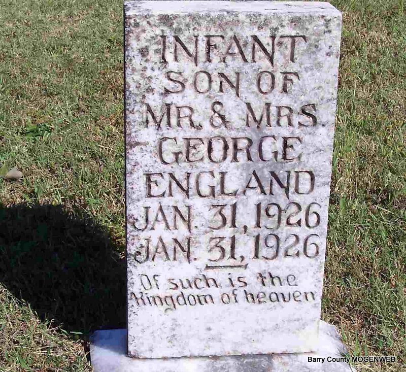 | ENGLAND, Infant | Jan. 31, 1926 | Jan. 31, 1926 | Inscription: "Infant Son of Mr. and Mrs. George England - Of Such is the Kingdom of Heaven" - Research Note: Infant Son of George and Minerva (Brock) England. | Headstone Norma Hayward Note Donna Cooper Photo Diana Cope |