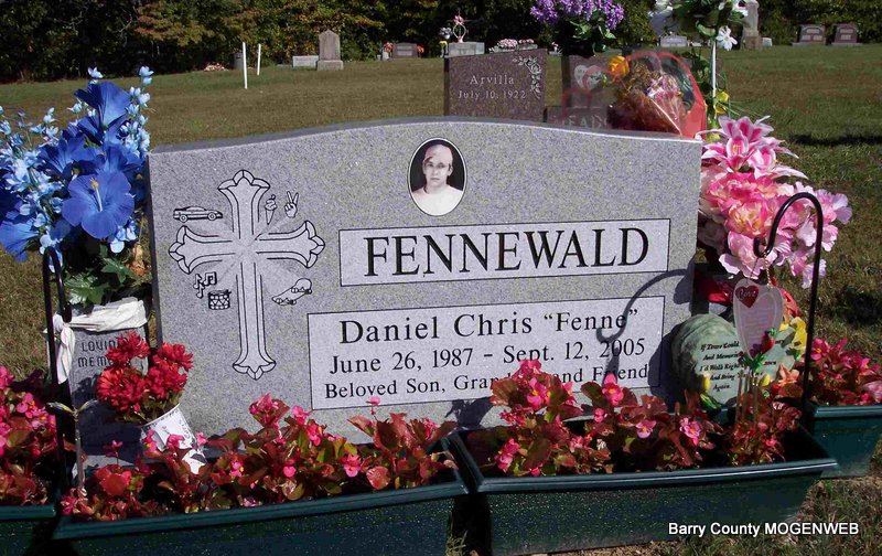 | FENNEWALD, Daniel Curtis "Fenn" | June 26, 1987 | Sept. 12, 2005 | Inscription: "Beloved Son, Grandson and Friend" - Photo on Stone | Photo Diana Cope |
