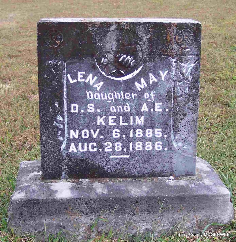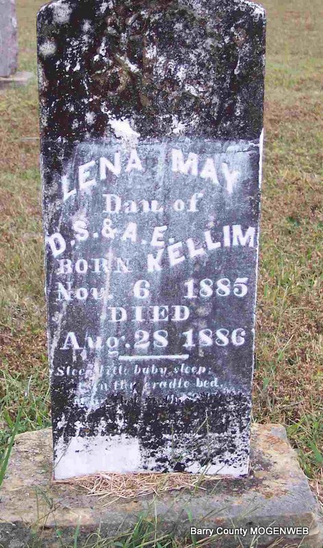 SSW: Melissa - Research Note: Son of Daniel Seaton Kellim and America Elizabeth Ashby. Residence was Cassville, MO. He was a teacher and farmer. Alvin Kellim was the informant on the death certificate. - Kellim Stones | Obituary Linda Lohrum Census Death Certificate Phyllis Long Photo Diana Cope |
