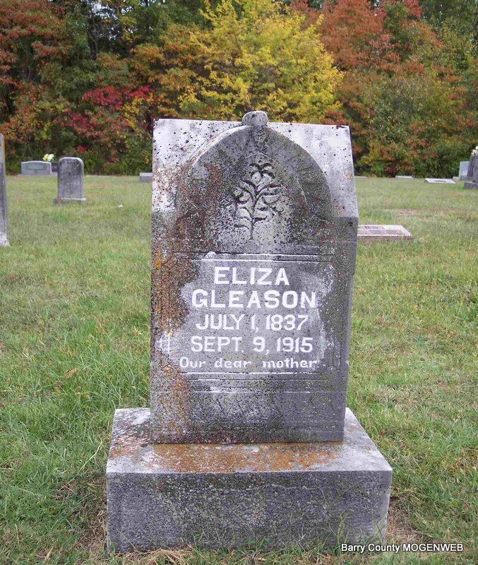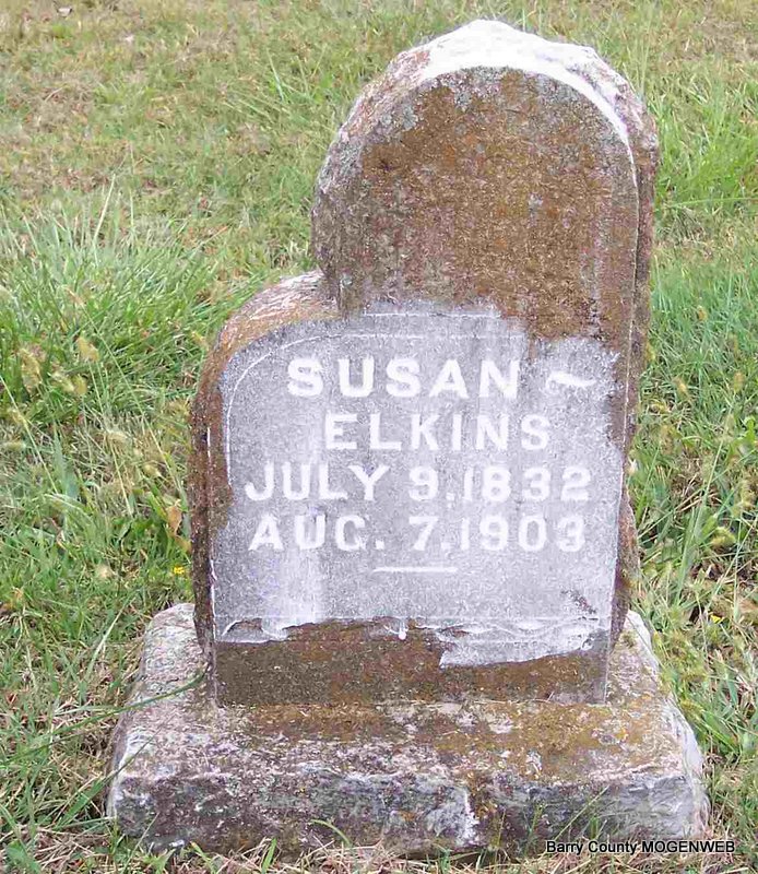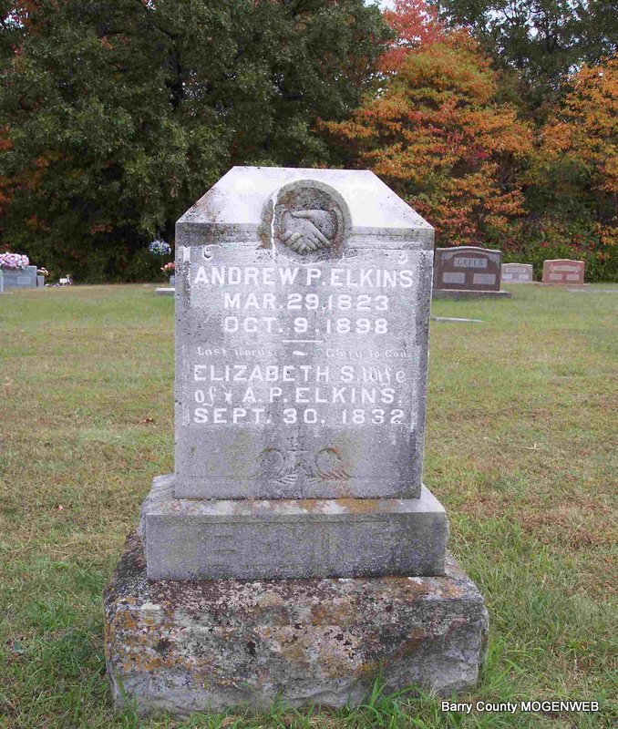 SSW: Andrew P. - Inscription: "Wife of A. P. Elkins - Last Words - Glory to God" - Research Note: Researchers say she was the daughter of John Hagan and Parmelia Hannah Means. - February 24, 1906, Cassville Democrat - Mrs. Elizabeth Elkins died Saturday night at the home of her son, Rev. John Elkins, just west of town, of paralysis, age 74 years. She was a consisted member of the Holiness Church and died in that faith. She left two sons to mourn her death. The remains were conveyed to Mineral Springs and laid to rest in the cemetery at that place Tuesday afternoon. | Headstone Norma Hayward Online Newspapers Phyllis Long Photo Diana Cope |