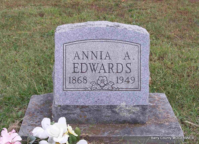 Inscription: "Married to Charles Efton Mar. 28, 1931" - Research Note: Daughter of Noah M. Ray and Martha Ann Snider. She was a lifetime area resident and homemaker. She was a member of Faith Baptist Church, rural Verona. She married Charles Efton Edwards on March 28, 1931, at Cassville. He died Feb. 8, 1965. She was also preceded in death by a son and two daughters. | Headstone Norma Hayward Obit Census Phyllis Long Photo Diana Cope |