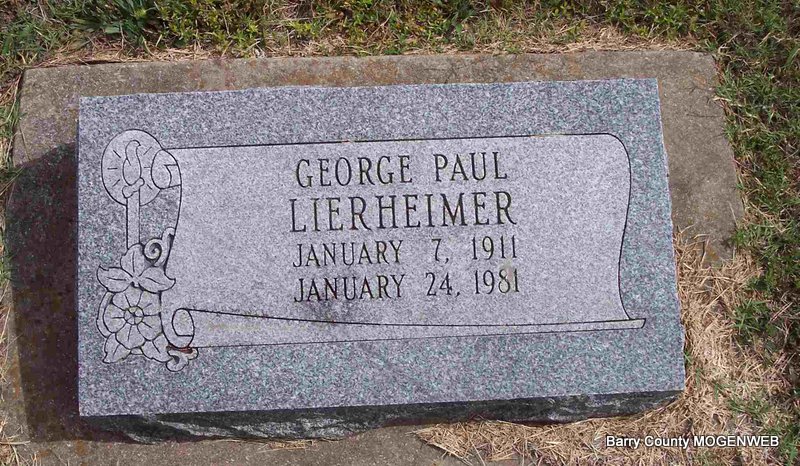| LIERHEIMER, George Paul | Jan. 7, 1911 | Jan. 24, 1981 | Research Note: Son of George Frederick Lierheimer and Lillie Dale Erisman. He first married Edith Loree Callaway on June 8, 1932 in Randolph Co., MO. George Paul Lierheimer, age 42, married Opal (Davis) Frazier, age 50, on Mar. 15, 1953 in Monett, Barry Co., MO. He third married Bernita Mae (Sisney) (Ennis) Rutledge in 1966. She is buried at Mineral Springs Cemetery under Rutledge. Her first husband was Sam Ennis, listed on this page. See Samuel Ennis for more information on Bernita. | Headstone Norma Hayward Census MO Marriage Records Phyllis Long Photo Diana Cope |