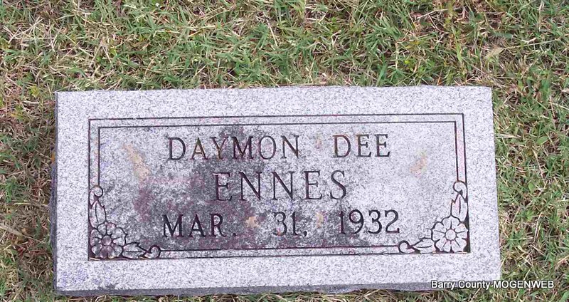 | ENNES, Daymon Dee | No Date | Mar. 31, 1932 | Research Note: Son of Samuel Herbert Ennis and Bernita Mae (Sisney) (Ennis) (Lierheimer) Rutledge. | Headstone Norma Hayward Census Phyllis Long Photo Diana Cope |