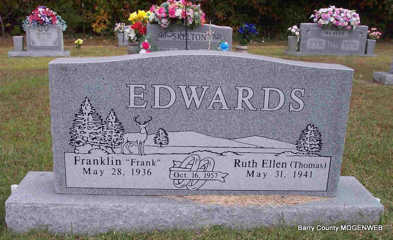SSW: Ruth Ellen - Inscription: "Married Oct. 16, 1957" - Research Note: Son of Charles "Efton" Edwards and Mary Elizabeth "Bessie" Ray. On Oct. 16, 1957 in Jenkins, MO, Frank was united in marriage to Ruth Ellen Thomas; they were married for nearly 67 years. Ruth survives. Also surviving are one daughter, Carolyn Blankenship, and her husband Freddie; two grandsons, Richard Franklin Isley and Hank William Isley; three great grandkids, Kaitlyn Anderson, Hailey Isley, and Hank Isley, Jr.; two great-great-grandkids, Aiden Conner Harrison and Raelynn Cole Harrison and one step granddaughter, Crissy Isley; one brother and five sisters. Preceding him in death were his parents; one brother; two sisters and a step-grandson, Cody Blankenship. Frank went to school at Mt. Zion, Munsey, Eagle Rock, Fairview, and Cassville. He lived most of his life in Barry County. He was a truck driver and drove for a lot of different companies including Farmers CO-OP in Monett for 16 years and hauled live and frozen poultry. Frank worked for Forest Products Incorporated for almost 14 years. He enjoyed riding horses, camping, fishing, throwing horseshoes, playing guitar, singing country music, reading western books and watching western movies. He loved his family and enjoyed spending time with them. He will be missed by those who know him. | Fohn Funeral Home L. Pearce Census Phyllis Long Photos Diana Cope |