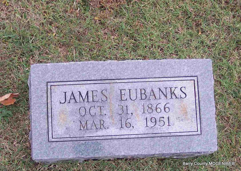 Research Note: He was widowed. James Eubanks, age 27, married Mollie Maddox, age 17, on Oct. 17, 1895 in Barry Co., MO. W. D. Maddox, father of Mollie, gave consent. Mollie, along with his parents William and Matilda are buried at Stubblefield Cemetery. Son of William Eubanks and Matilda Jane Counts. Closest relative was Mrs. Roy Bush. Funeral was charged to William E. Eubanks of Detroit, MI. Cost of funeral was $368 for Embalming Body and trip to CO. | Headstone Norma Hayward Funeral Record MO Marriage Records Phyllis Long Photo Diana Cope |