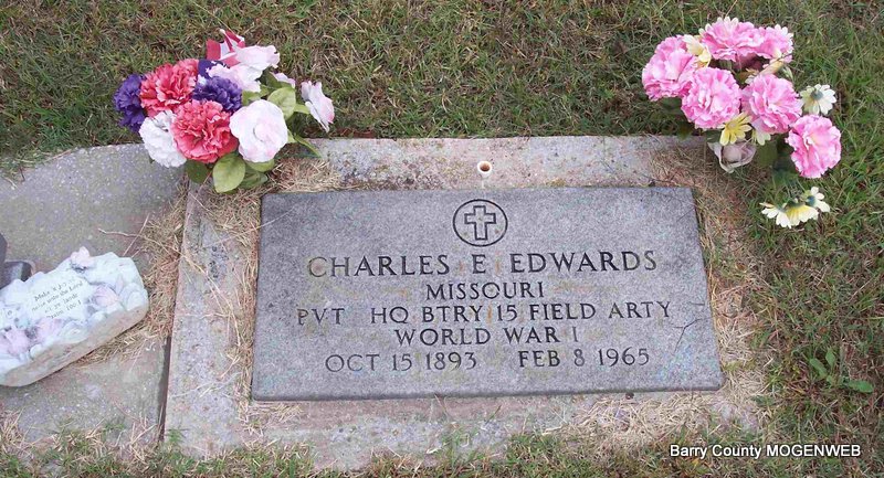 Inscription: "MISSOURI PVT HQ BTRY 15 FIELD ARTY WORLD WAR I" - Research Note: Son of William Edwards and Annie America Carter. His wife was Mary Elizabeth "Bessie" Ray and she was the informant on the death certificate. | Headstone Norma Hayward Census Death Certificate Phyllis Long Photo Diana Cope |