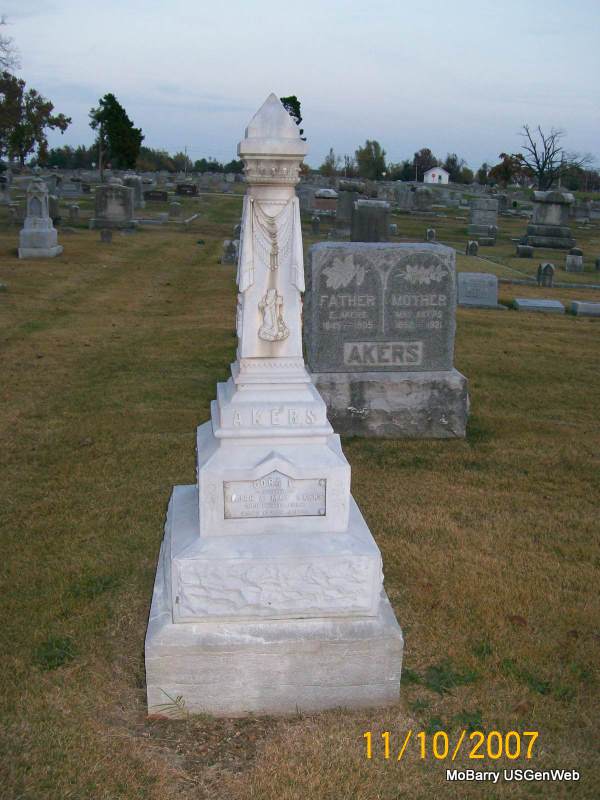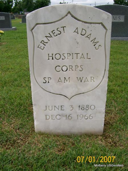 SSW: Hannah E. - Research Note: Father given only as Adams and mother's maiden name Smith on the death certificate. Usual residence was Monett, MO. His wife Hannah was the informant on the death certificate. - 1910 Census, Monett Ward 1, Barry, Missouri - Ernest Adams, head, age 28, married 4 years, born IN, parents born IN, Express manager; Hannah, wife, age 21, married 4 years, no children, born AR, father born MI, mother AR. - Military Stone - Inscription: "HOSPITAL CORPS SP AM WAR" | Census Death Certificate Phyllis Long Photos Jay Trace |