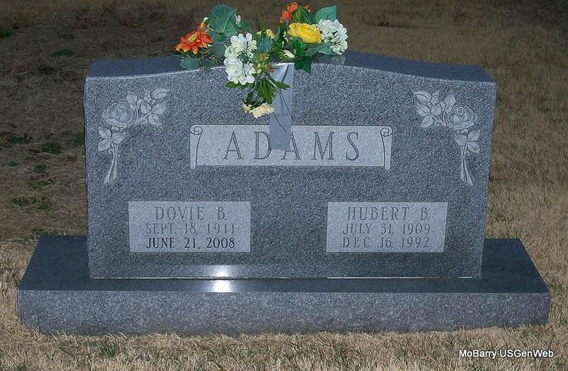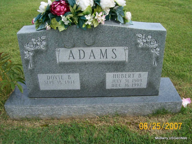 | ADAMS, Hubert B. | July 31, 1909 | Dec. 16, 1992 | SSW: Dovie B. - Research Note: Son of Addison Alphus Adams and Ada B. Beasley. - Another Photo | Census Phyllis Long Photos Jay Trace |