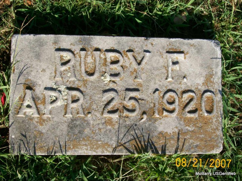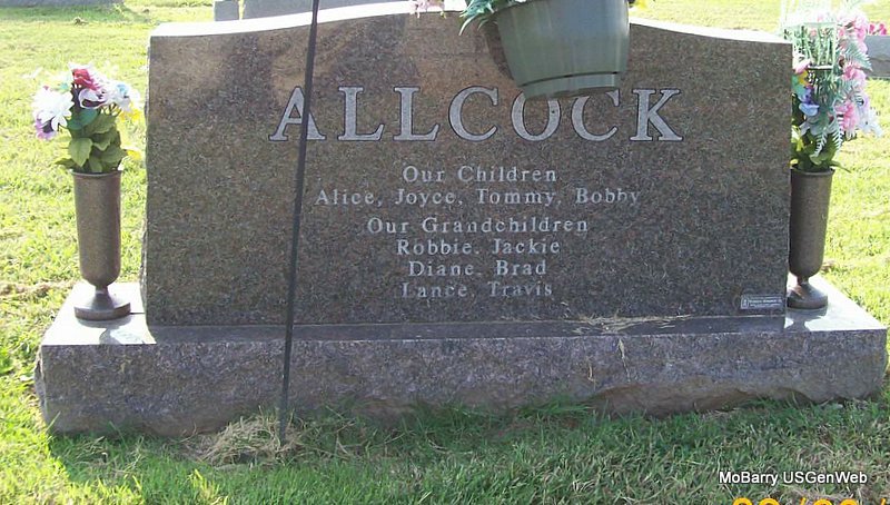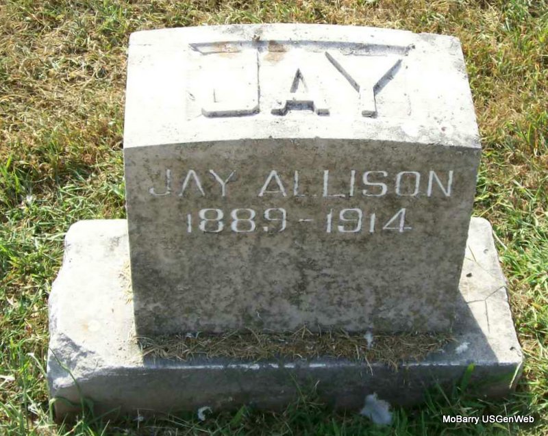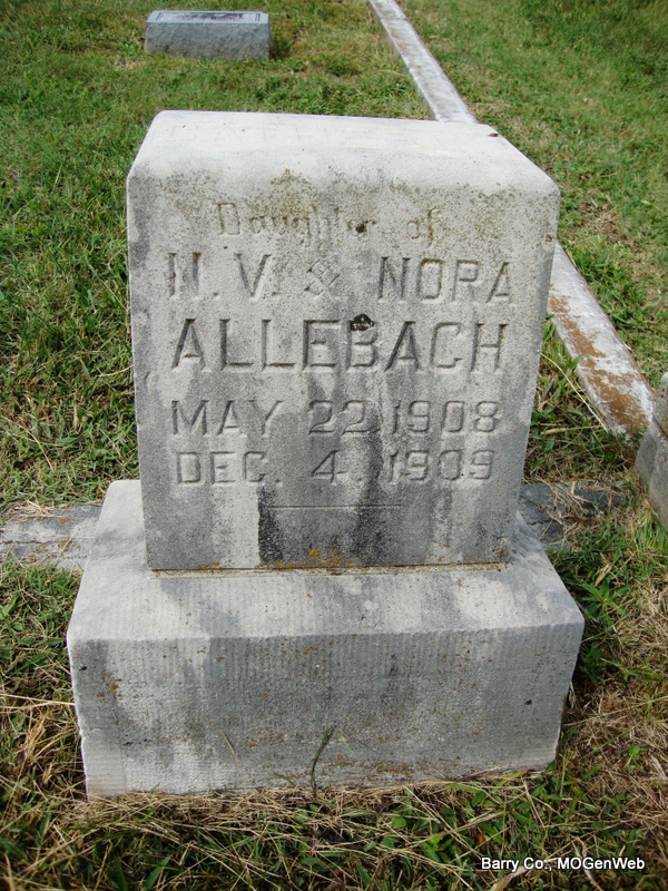 Research Note: According to his death certificate he was a son of Jerry Allred, born in Barry Co., MO and his wife Mary S. Smith, born in KY. The City of Monett has that this child has no stone and that he is buried in the old section, in block 3, lot 4, grave 7 in the SE 1/4 section. J. N. Allred purchased the lot. They have that he was buried on Oct. 9, 1911. NO STONE | Death Certificate Donna Cooper |