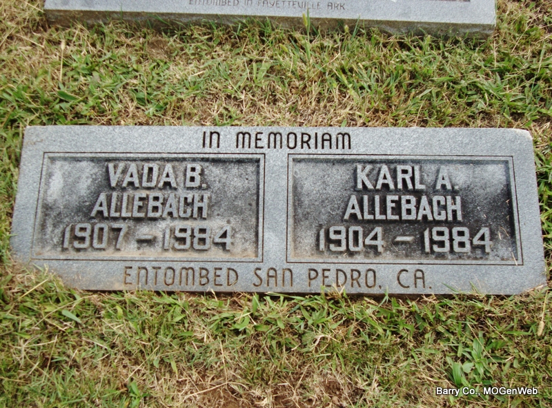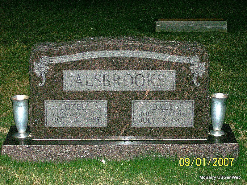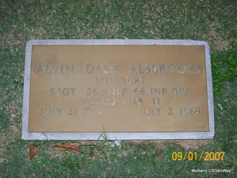 | ALSBROOKS, Alvin Dale | July 21, 1916 | July 2, 1969 | SSW: Lozell - Research Note: Son of William Hamilton Alsbrooks, died 1930, and Aretta Jane Terry, died 1918. 1920 Census, he is age 3 and living with Jake and Fannie Parkison. - Military Stone - Inscription: "MISSOURI S SGT 264 INF 66 INF DIV WORLD WAR II" | Census Phyllis Long Photos Jay Trace |