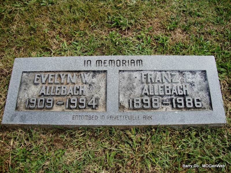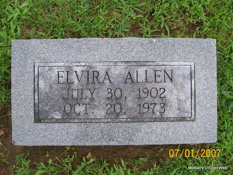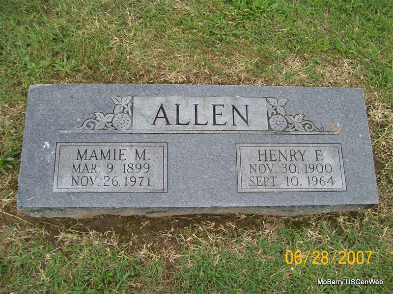 | ALLEN, Mamie Mae (MOORE) | Mar. 9, 1899 | Nov. 26, 1971 | SSW: Henry F. - Research Note: Henry F. Allen, age 32, married May M. Moore, age 31, on July 16, 1932 in Carthage, Jasper Co., MO. She may have second married Roy Howard under her maiden name Moore. Mamie M. Moore, age 70, married Roy Howard, age 68, on Oct. 4, 1971 in Mt. Vernon, Lawrence Co., MO. | MO Marriage Records Phyllis Long Photo Jay Trace |
