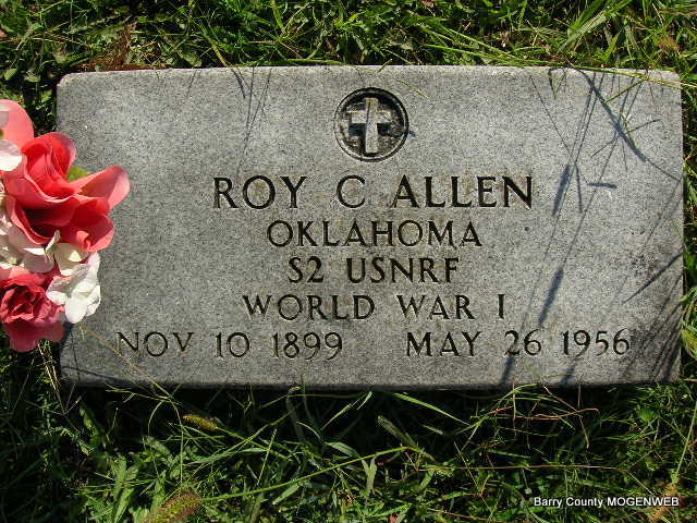 Inscription: "Oklahoma S2 USNRF WW I" - Research Note: Vesta (Kelley) Allen was his wife. His occupation was a boiler maker and he was a WW I Veteran. He was a son of Joe and Libbie (Glenn) Allen. - Another Photo | Death Certificate Phyllis Long Photo Connie Schmidt |