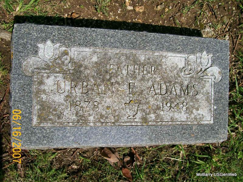 Research Note: His death certificate has his name spelled as Urben and his stone has it Urban. His stone has 1878 as his birth year and the death certificate gives it 1879. He was a contractor by occupation. His father was given as William Adams, born in KY. His mother was named Bilina Pruitt, born in IN. Mable Adams was given as his wife's name. Mrs. Mable Adams of Purdy, MO, gave the information. Mable Adams purchased the cemetery lot. | Death Certificate Note Donna Cooper Photo Jay Trace |