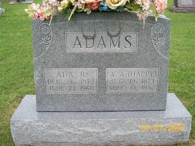 SSW: A. A. "Happy" - Research Note: Her obit gives year of birth as 1874, but her stone reads the year as 1872. - She was the daughter of J. O. Beasley and Sarah Ashby. Mrs Coy Wadley of Monett, MO was the informant on the death certificate. - Mrs. Ada Adams of Monett Dies This Morning; Was Longtime Resident of Community; Mrs. Ada B. Adams, 86, a resident of Monett for 50 years, died this morning at a local rest home following a lingering illness. Born at Hanson, Ky., December 26, 1874, she was married to A. A. Adams in 1904 in Hopkins County, Ky. They later moved to Monett to make their home. She was a member of the First Methodist Church. Funeral services are incomplete but will be under the direction of Buchanan Funeral Home. | Death Certificate Monett Times Phyllis Long Photo Note Jay Trace |