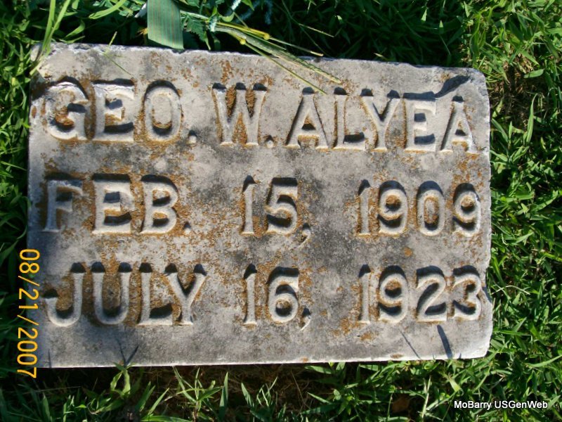 Research Note: His death certificate gives his birth date as Feb. 14, 1909 and not Feb. 15, 1909 as the stone reads, and also his death date as July 16, 1922, and not July 15, 1923 as the stone reads. He was given as age 13. Ruptured appendicitis was the cause of death. His father was given as J. M. Alyea, born KS and his mother Myrtle Underwood, born MO. J. M. Alyea was the informant. | Death Certificate Donna Cooper Photo Jay Trace |