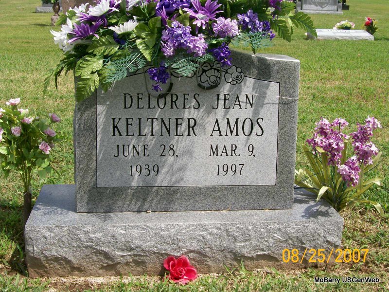 | AMOS, Delores Jean (KELTNER) | June 28, 1939 | Mar. 9, 1997 | Research Note: Daughter of Eugene Clyde Keltner and Geneva Pauline Beard, both buried at IOOF Cemetery. Husband probably Charles Amos. | Census Phyllis Long Photo Jay Trace |