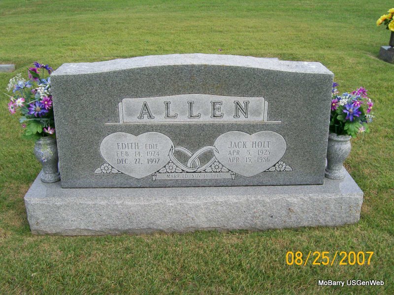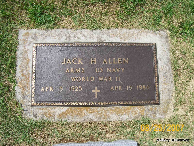 | ALLEN, Jack Holt | Apr. 5, 1925 | Apr. 15, 1986 | SSW: Edith Edie - Research Note: Son of Fred M. Allen and Alta Jane Holt. - Military Stone - Inscription: "ARM 2 US NAVY WORLD WAR II" | Census Phyllis Long Photos Jay Trace |
