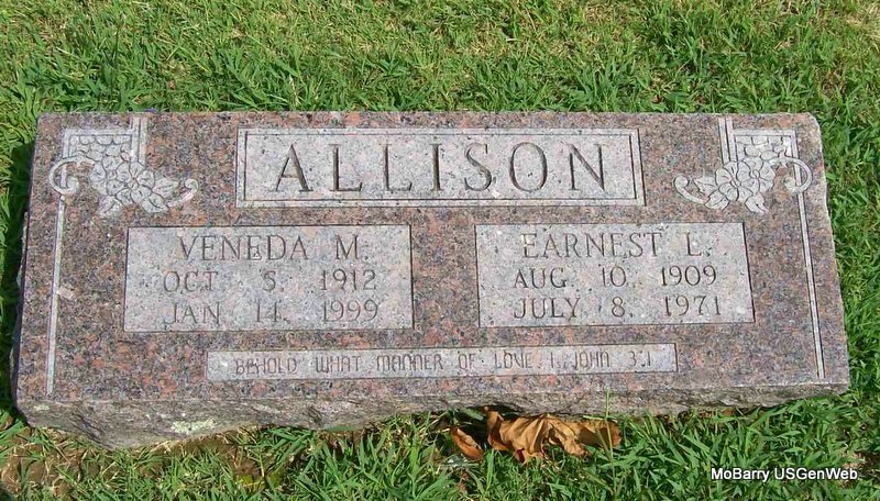 | ALLISON, Veneda M. (HENTE) (DOTY) (HENDERSON) | Oct. 5, 1912 | Jan. 14, 1999 | SSW: Earnest L. - Research Note: Veneda Hente, age 24, first married Lloyd Doty, age 33, on May 12, 1937 in Cape Girardeau, Cape Girardeau Co., MO. Veneda Hente, age 25, second married Earnest Louis Allison, age 28, on May 26, 1938 in Jackson, Cape Girardeau Co., MO. Veneda May Allison, age 61, third married Oren Carl Henderson, age 66, on Oct. 28, 1973 in Monett, Barry Co., MO. | MO Marriage Records Phyllis Long Photo Jay Trace |