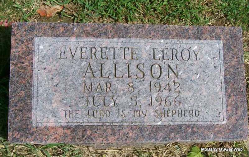 Inscription: "The Lord is My Shepherd" - Research Note: He is buried in the old section in block 63, lot 4, grave 6 and has no stone according to the City of Monett - but does have a stone. Son of Ernest Allison and Veneda M. Fitzgerald. His wife was Leola and she was the informant on the death certificate. Usual residence was rural Springfield, MO. Cause of death was auto accident at 10:30 p.m. in Springfield, MO. | Note Donna Cooper Death Certificate Phyllis Long Photo Jay Trace |