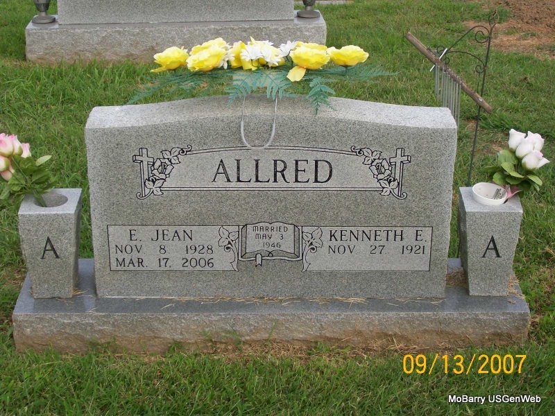 SSW: Kenneth - Inscription: "Married May 3, 1946" - Research Note: Jean Allred, age 77, of Monett, died today, March 17, at Cox Monett Hospital. She was born Nov. 8, 1928, in Memphis, TN, and was a daughter of Charles and Nettie Bell Holland. She married Kenneth Allred in 1946 according to the Mar. 17, 2006, Monett Times newspaper. | Note Donna Cooper Photo Jay Trace |