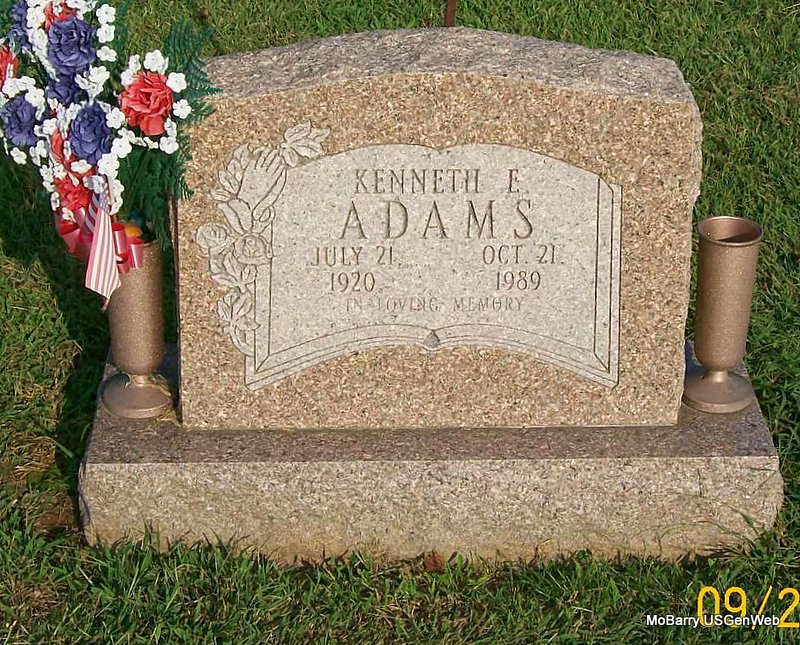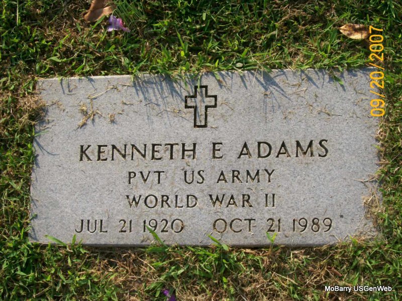 | ADAMS, Kenneth E. | July 21, 1920 | Oct. 21, 1989 | Inscription: "In Loving Memory" - Military Stone - Inscription: "PVT US ARMY, WWII" - Research Note: He is buried in the 3rd section, in block 9 in a single lot. Buchanan Funeral Home took care of the arrangements and he was a veteran. | Note Donna Cooper Photo Jay Trace |