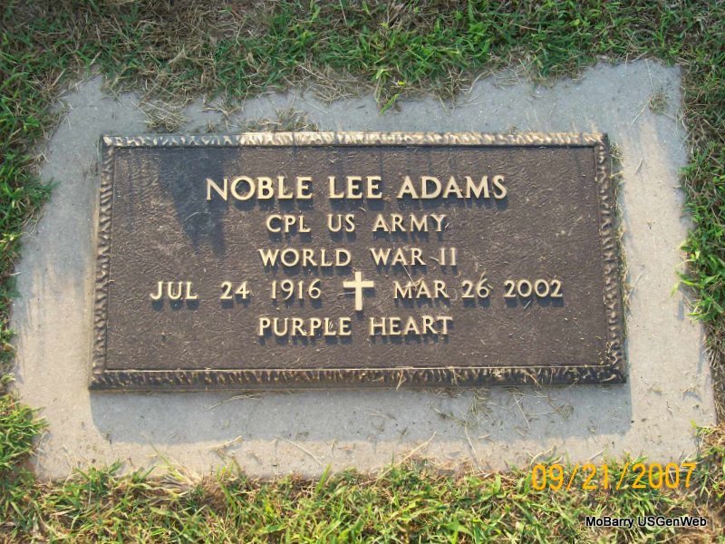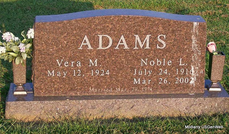 SSW: Vera M. - Inscription: "Married Mar. 29, 1974" - Research Note: Age 85 - Donna's Note: Noble Lee Adams, age 85, of Aurora, died Mar. 26, 2002, at Lacoba Nursing Home in Monett. He was born July 24, 1916, in Shelbina, the son of William and Elva Mae (Kirk) Adams. He was retired from Jumping-Jacks Shoes, an Army veteran of World War II, and a member of the First Christian Church (Disciples of Christ) in Monett. He married Vera M. Ferguson on Mar. 29, 1974, in Miami, OK according to the Monett Times. - Military Stone - Inscription: "CPL US ARMY WORLD WAR II - PURPLE HEART" | Monett Times April 1, 2002 Mary Homesley Obit Donna Cooper Photo Jay Trace |