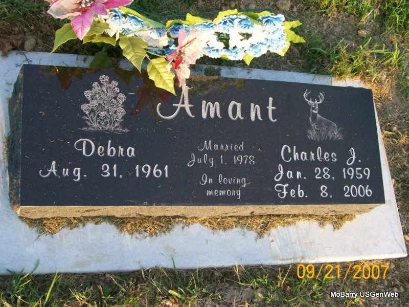 SSW: Debra - Inscription: "Married July 1, 1978" - Research Note: Charles Junior Amant, age 47, of Aurora, died Feb. 8, 2006, at the Cox Medical Center South in Springfield. He was born January 28, 1959, in Taft, CA. He married Debbie Eggert in 1977, which is a different date from what is on the stone according to the Monett Times Feb. 9, 2006. - Another Photo | \Note Donna Cooper Photos Jay Trace |