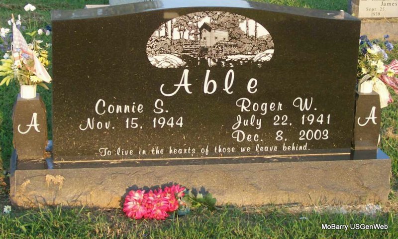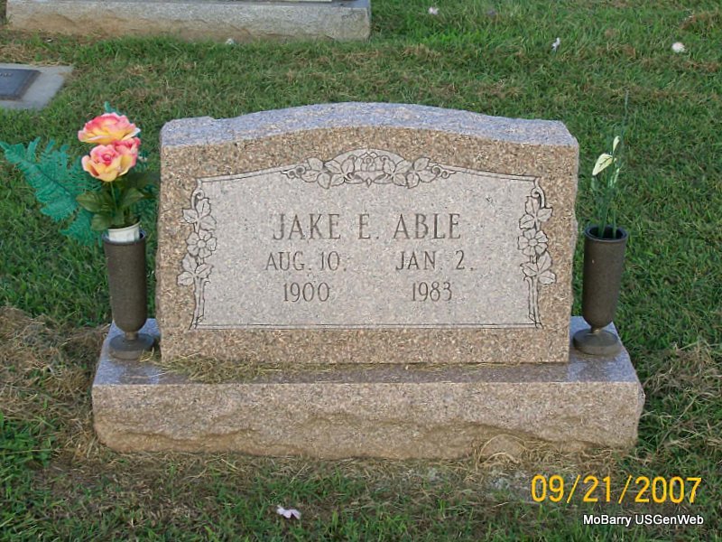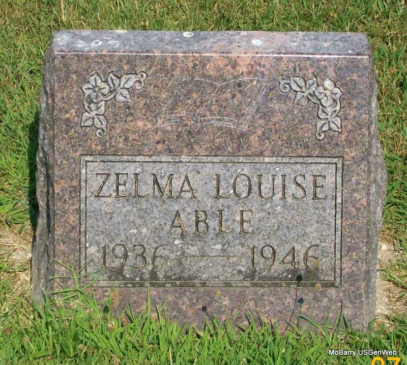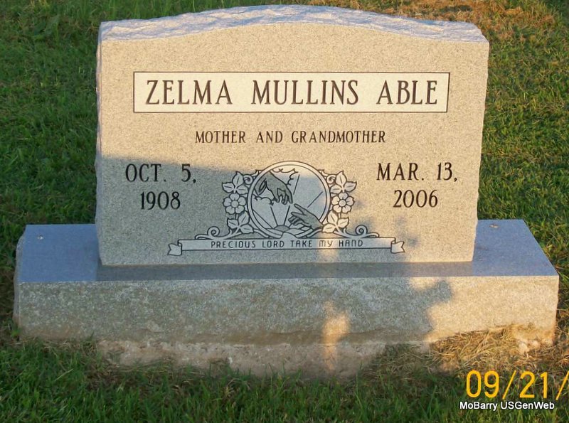 Inscription: "Mother and Grandmother" - Research Note: Zelma Able, age 97, of Pierce City, MO, died March 13, 2006, at St. John's Regional Health Center in Springfield. She was born October 5, 1908, in Pierce City, MO, and was a daughter of Henry and Bertha (Boyd) Mullins. She married Jake Able on Apr. 16, 1929 in Neosho, Newton Co., MO, and he preceded her in death in 1983. She was preceded in death by seven sons, John, Bob, Lewis, Ronnie, James, Roger, and Rolla; and two daughters, Louise and Sandra. The cemetery log book has that the lot owner was Marilyn Blackburn of Wentworth, MO. | Monett Times Donna Cooper Log Book Phyllis Long Photo Jay Trace |