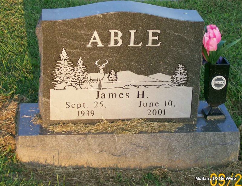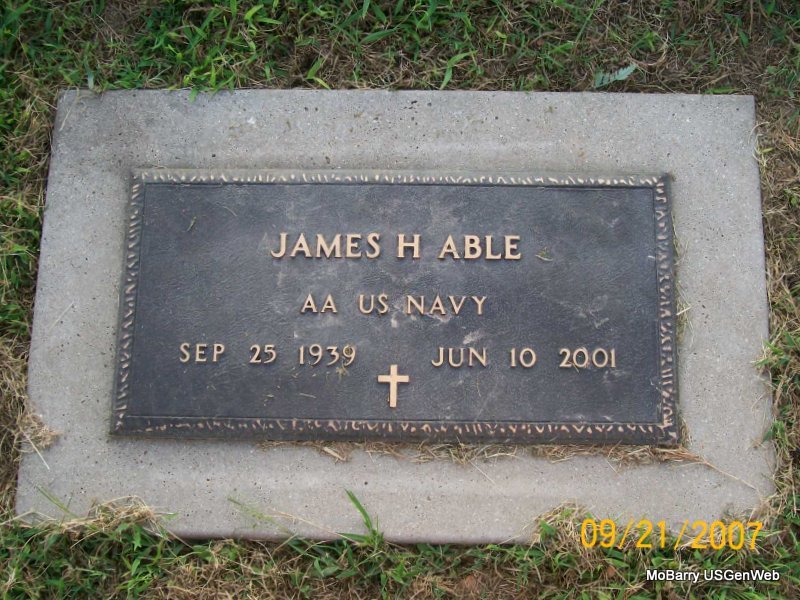 Research Note: Son of Jake Able and Zelma Mullins. Navy veteran of the Vietnam conflict, was preceded in death by his father, Jake Able; five brothers, Jay, Lewis, Ronnie, Bob, and Rolla Able; and one sister, Louise Able. Donna's Post: He was a lifetime Monett resident. He was an employed at the Monett Police Department as animal control officer. He was a Navy veteran of the Vietnam conflict. He was a member of Faith Worship Church in Aurora and Tom Wolfe Memorial Post 4207 Monett Veterans of Foreign Wars. - Military Stone - Military Inscription: "AA US NAVY" | On Line Obit Monett Times June 11, 2001 Mary Homesley Obit Donna Cooper Photo Jay Trace |