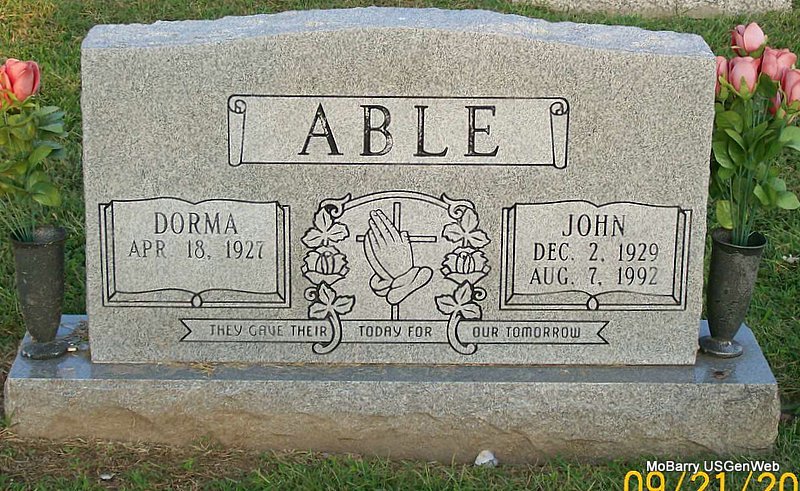 | ABLE, John Lewis | Dec. 2, 1929 | Aug. 7, 1992 | SSW: Dorma - Research Note: He was a son of Jake and Zelma (Mullins) Able. John L. Able, age 19, first married Juanita Mae Scroggins, age 19, on Apr. 14, 1949 in Benton Co., AR. He second married Dorma. | Note Donna Cooper AR Marriage Index Census Phyllis Long Photo Jay Trace |