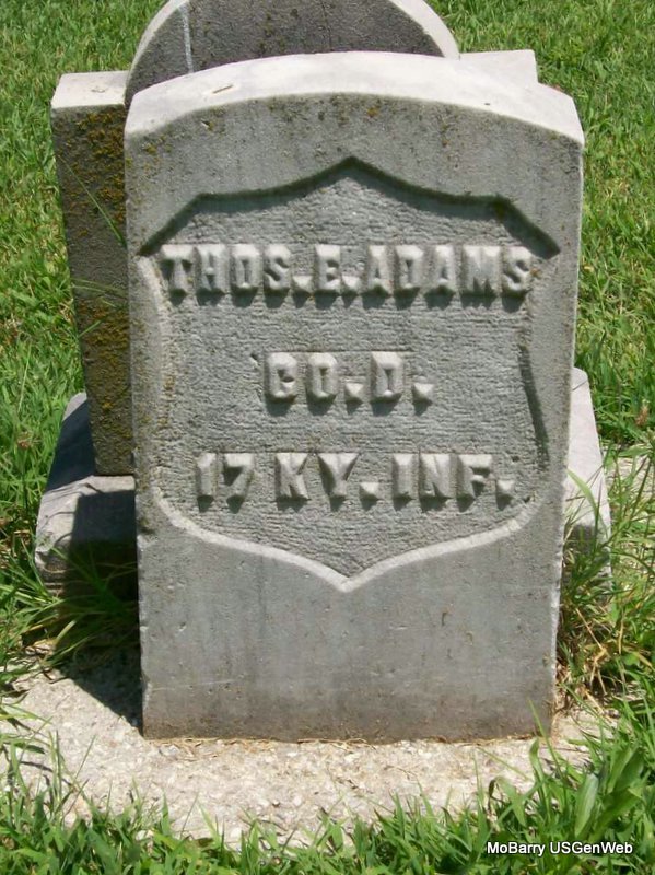 Inscription: "CO D 17 KY INF.- CIVIL WAR" - Research Note: W. O. Adams purchased the cemetery lot. Callaway Funeral Home records state that Thomas E. Adams died Oct. 22, 1908 on 3rd St., in Monett, MO, and the cause of his death was given as paralysis. He was 67 years old. His wife was Mary Ellen Massie. - Another Photo | Note Donna Cooper Photo Jay Trace |
