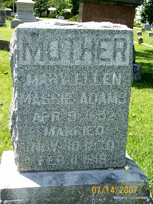 | ADAMS, Mary Ellen (MASSIE) | Apr. 9, 1852 Hancock Co., IL |