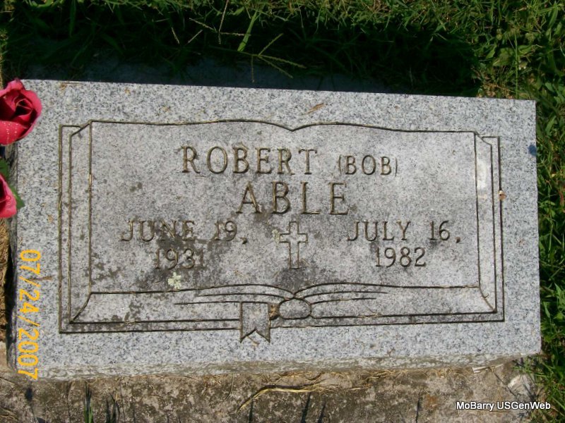 | ABLE, Robert "Bob" | June 19, 1931 | July 16, 1982 | Research Note: He was a son of Jake and Zelma (Mullins) Able. The log book has that he was a veteran, no other information was given. His wife was Laura Bea Hartness at the time of his death. Married first Barbara Lovell about 1954. Bobby Gene Able, age 28, married Frances Allene Waddle, age 26, on Sept. 12, 1959 in Monett, Barry Co., MO. | Note Donna Cooper Note MO Marriage Records Phyllis Long Photo Jay Trace |