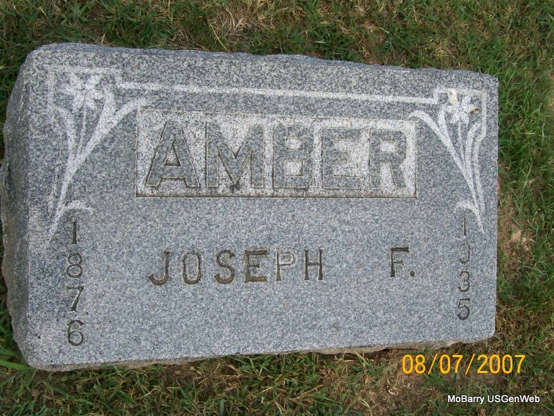 Research Note: His death certificate reads that Joseph Amber, born Berlin, Germany was his father and that Margaret Sweeney, born Ireland was his mother. He was a car inspector for the Frisco Railroad. Mabel Amber was given as his wife's name and he lived at 509 5th St., Monett, Barry Co., MO. The cause of death was typhoid fever and myocardial disease, mitral insufficiency. - Amber Plot Stone | Death Certificate Donna Cooper Photos Jay Trace |