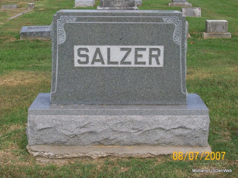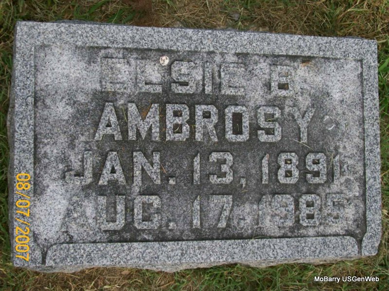 | AMBROSY, Elsie Bertha | Jan. 13, 1891 | Aug. 17, 1985 | Research Note: The cemetery log book has that Roisch, Shawnee, OK was the funeral home. She is buried in the Salzer cemetery plot, near John and Elizabeth (Young) Salzer, her parents. Elsie B. Salzer first married George W. Carey on June 19, 1911 in Monett, Barry Co., MO. She second married Joseph A. Ambrosy, a veterinarian, in OK. | Note Donna Cooper MO Marriage Records Census Phyllis Long Photo Jay Trace |