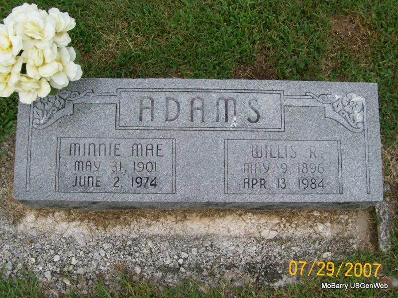 | ADAMS, Minnie Mae (JOHNSTON) | May 31, 1901 | June 2, 1974 | SSW: Willis Raymond - Research Note: Daughter of Wimple Johnston and Lucy Thomas. SSDI gives her last residence as Pawnee, Pawnee Co., OK. | Note 1741 Eden Plains Rd., Brentwood, CA. 94513 Rose M. Adams SSDI Phyllis Long Photo Jay Trace |