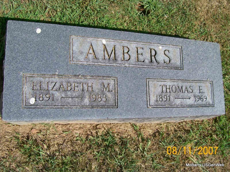 SSW: Elizabeth M. - Research Note: Son of William Ambers, mother not named on the death certificate. He first married Beulah C. Gregg. Beulah second married Melvin W. Forrester. Thomas second married Elizabeth and she was the informant on. | MO Marriage Records Phyllis Long Photo Jay Trace |