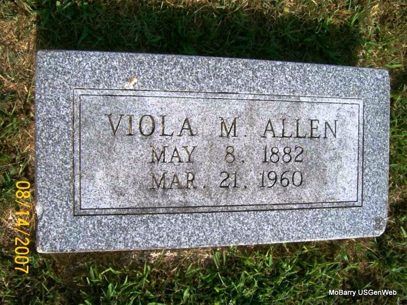 Research Note: Died at the age of 77 years. Michael's Note: She married Joseph Allen (Son Of Levi and Nancy (Marshall) Allen whom are buried at McCormick - St. John's Lutheran Cemetery) on April 3, 1901 in Lawrence Co., before moving to Washington State. Joseph died on Oct. 9, 1953 in Spokane City, Spokane Co., Washington. Viola's parents were: Wiley Winton and Eliza Belle (Killingsworth) Winton. | Monett Times Photo Jay Trace Lawrence Co. Marriages, 1910-1930 US Census, Death Certificates Michael Stone |