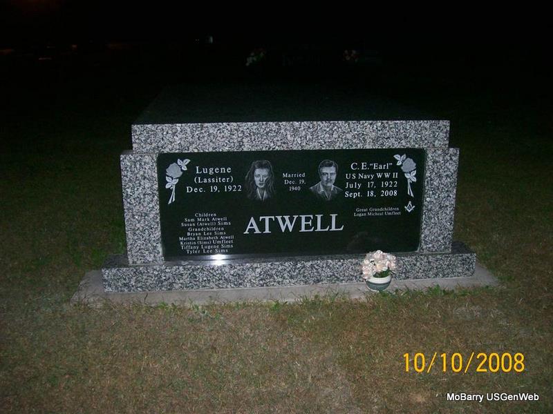 SSW: Lugene Lassiter - Inscription: "Married Dec. 19, 1940 - US Navy WW II" - Research Note: He was the eldest son of Clausie Laurels and Ella Etta (Powell) Atwell. Preceding him in death was one brother, Winford Louis Atwell; and one sister, Maxine Violet Smith. - Another Photo | Monett Times Photos Jay Trace |